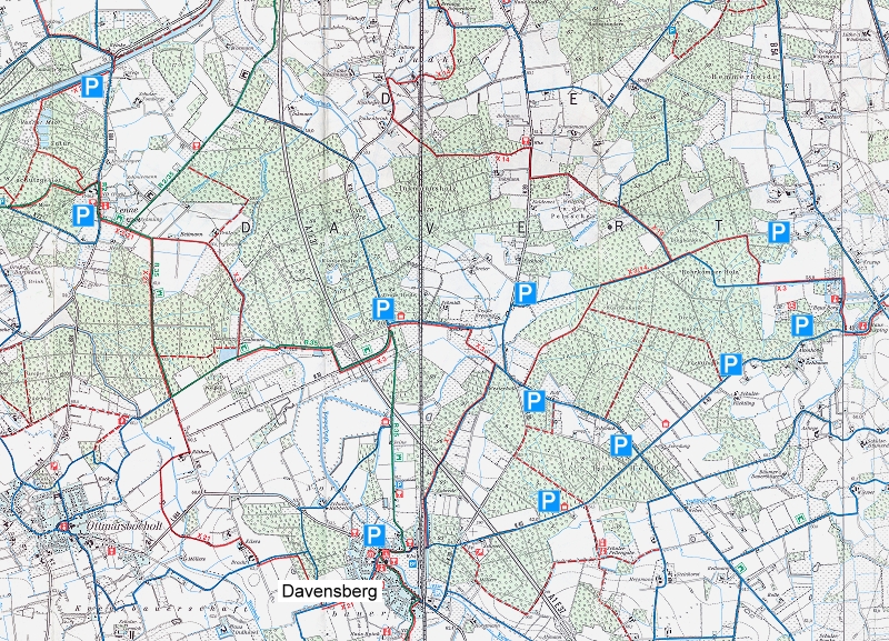 | Der Ort Davensberg liegt direkt am Rande des Naturschutzgebietes. Vom Wanderparkplatz am Burgturm Davensberg ist die Davert zu Fuß oder mit dem Fahrrad bequem zu erreichen. In der Davert laden verschiedene Waldparkplätze zum Rasten ein. Viele gekennzeichnete Rundwanderderwege durchziehen das Naturschutzgebiet, darüber hinaus führt auch der Wanderweg "X14" des Westfälischen Heimatbundes durch das Kerngebiet der Davert. |